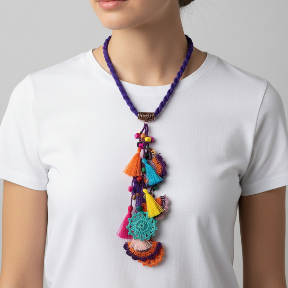 Kendinizi şımartın veya sevdiklerinize unutulmaz bir hediye verin! El Yapımı Tığ İşi Saçaklı Kolye ile tarzınızı ortaya koyun.