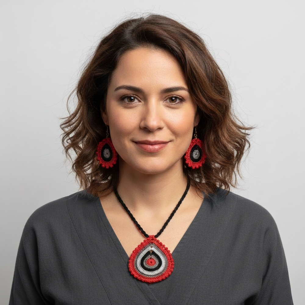 Takımımız, kaliteli iplikler ve doğal malzemeler kullanılarak tamamen el yapımı olarak üretilmiştir. Tığ işi tekniği ile hazırlanmış olan kolye ve küpeler, kadınların zarif ve şık bir görünüm elde etmelerini sağlamak üzere tasarlanmıştır. Her bir parça özenle yapılmış, dikiş detayları ve desenleri ile kendine has bir karakter kazanmıştır.